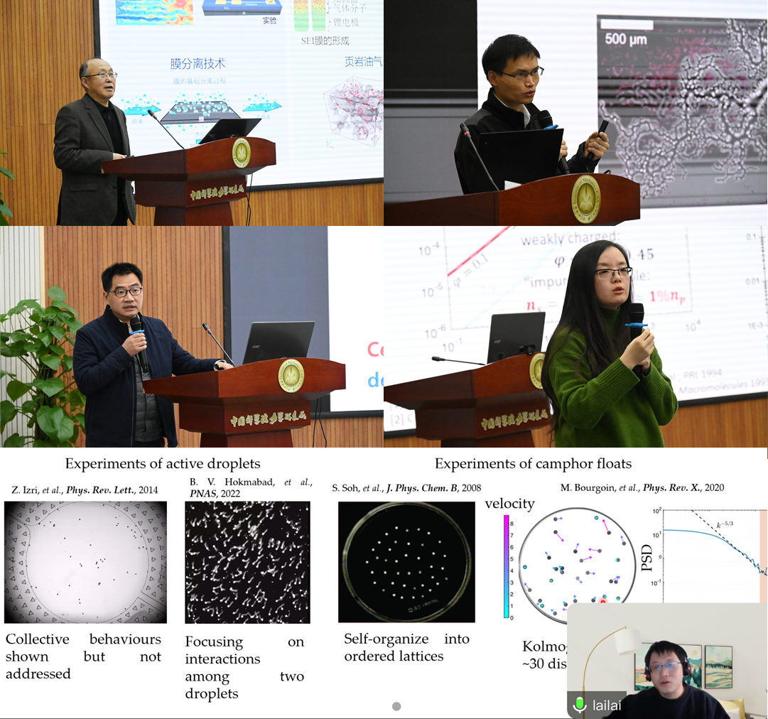 赵亚溥就力-化-电耦合下移动接触线的物理力学研究与应用进行了系统的介绍,吴艺林介绍了细菌群落中的活性界面力学的最新成果,叶方富介绍了胞外基质介导的细胞动力学的相关进展,朱来来介绍了泳动活性物质的涌现特征,陈光作了带电软物质的报告。
