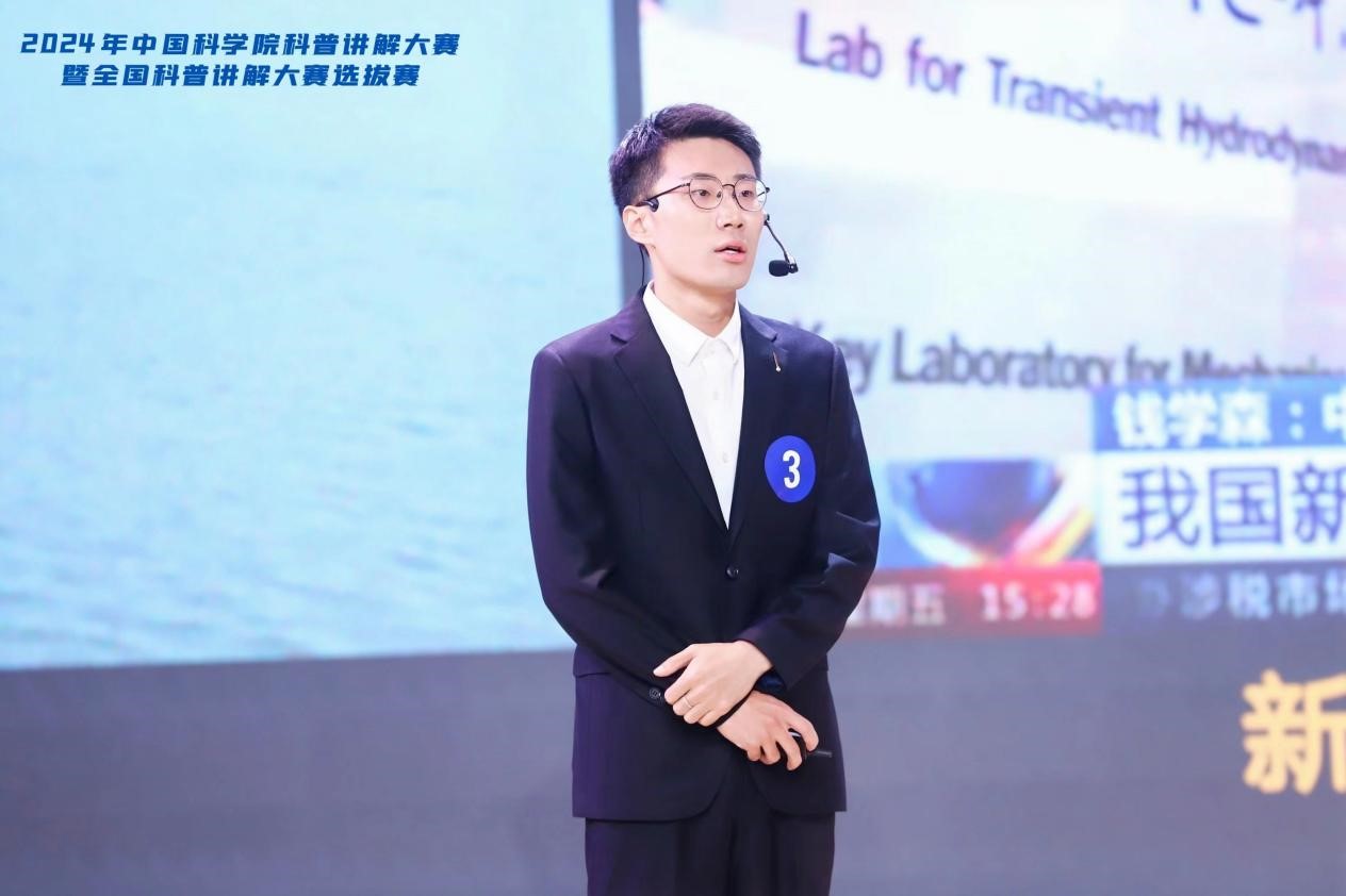 来自流固耦合系统力学重点实验室的博士生王永九以《水下的神秘力量——空化气泡》为题,结合丰富的动画视频演示,从能够干扰水下侦听设备的手枪虾切入,巧妙地引入了空化气泡的形成机制,介绍了空化气泡对海洋装备构成的威胁与挑战,并阐述了其在流动减阻方面的潜在应用。在最后,王永九展示了他所在科研团队在空化气泡研究领域的最新突破,不仅彰显了科研人员对海洋科技贡献的不懈追求,也体现了他们为建设海洋强国所付出的努力,赢得了评委和在场观众的广泛共鸣,最终进入决赛并获得二等奖。