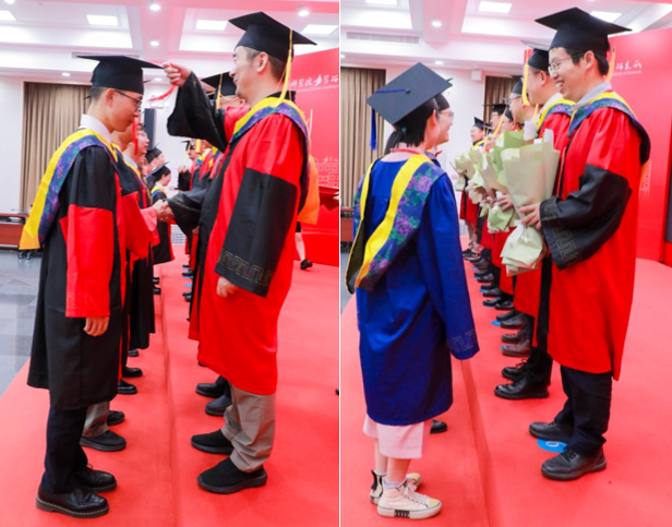 随后,与会的领导和导师代表依次为毕业生扶正流苏、颁发学位证书。