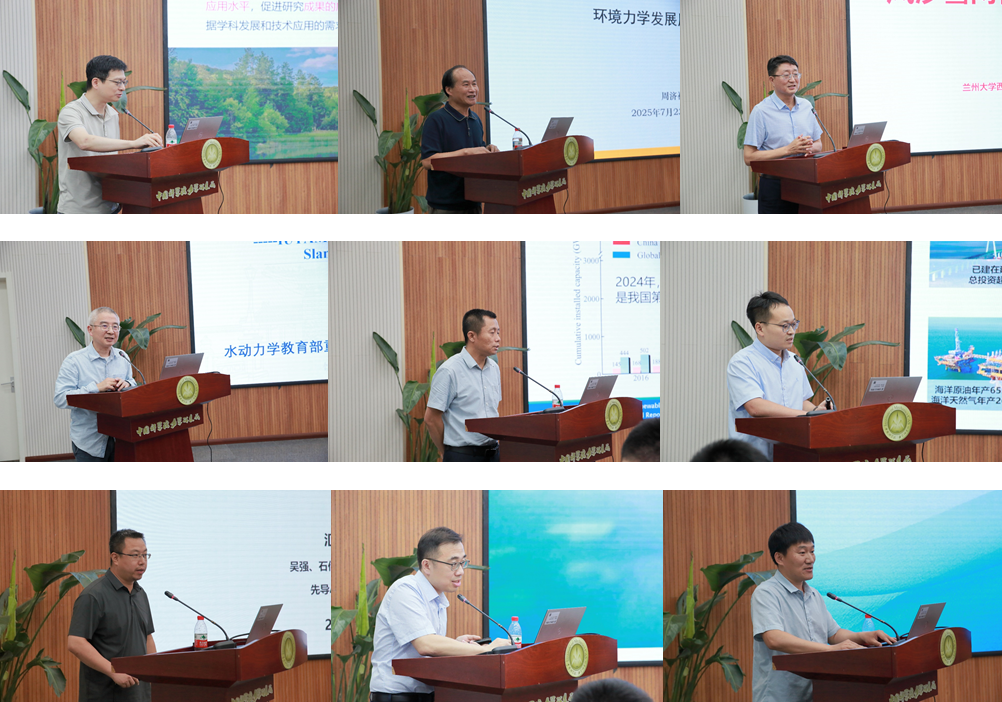 会上,周济福研究员率先作“环境力学发展历程与展望”报告,回溯学科发展脉络,展望未来趋势,为后续研讨奠定基础。黄宁教授聚焦“风沙(雪)两相流及其灾害防治”,剖析风沙雪灾害机理与防治思路。刘桦教授分享了 “波浪破碎研究进展”,展现该方向科研成果。王展研究员介绍了 “环境力学专委会的工作思路”,明晰专委会职责与规划 。
