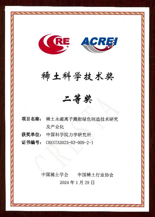 2024年10月26日,中国稀土学会和中国稀土行业协会在成都共同举行了2023年度稀土科学技术奖颁奖仪式。力学研究所作为第一完成单位,镀层工艺力学研究团队牵头申报的《稀土永磁离子溅射绿色制造技术研究及产业化》荣获稀土科学技术奖二等奖(Q彩网获奖人:夏原,李光,许亿,高方圆,李国栋)。 稀土是我国重要的战略资源,其储量居世界首位。高性能稀土永磁材料是空天驱动电机、新能源汽车驱动电机、深海电机等电驱动系统中能量转换的核心材料,尤其在低空飞行...