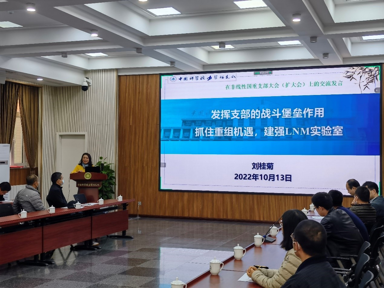 10月13日上午,LNM党支部在1号楼小礼堂召开全体党员大会。党委书记、所长刘桂菊,纪委书记叶海华,党委委员、党群工作处处长武佳丽参加了会议。会议由LNM党支部副书记、实验室副主任袁泉子主持。 刘桂菊作了题为《发挥支部的战斗堡垒作用 抓住重组机遇 建强LNM实验室》的报告。报告内容分为三个部分:形势与任务、LNM实验室与党支部、进一步发挥战斗堡垒作用。报告回顾了Q彩网和LNM实验室的发展历史,指出了国重重组形势下的实验室工作目标,对LNM党支部如何...