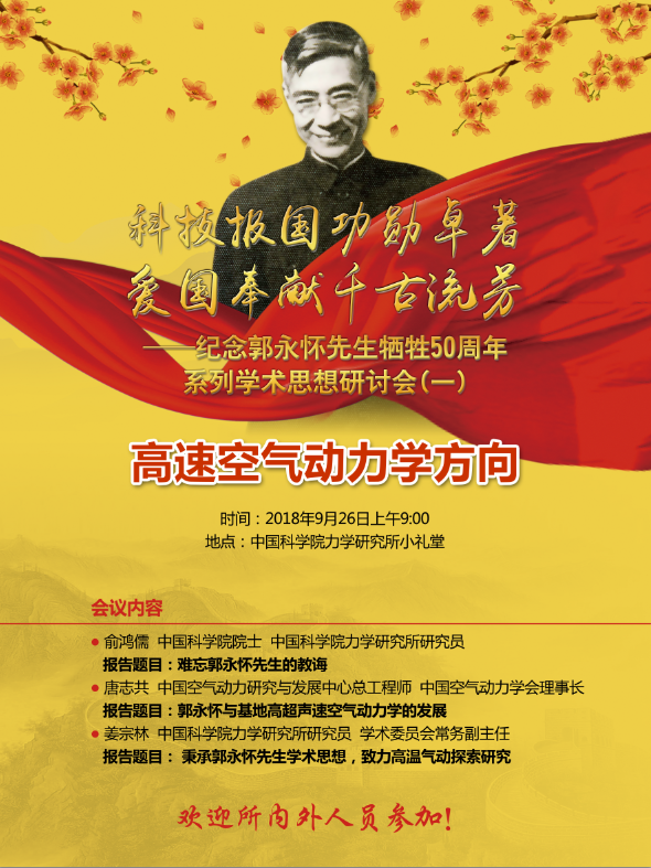 纪念郭永怀先生牺牲50周年学术思想研讨会拟举办3场, 将分别围绕郭永怀先生3个学术方向“高速空气动力学、磁流体力学和等离子体动力学、PLK方法和CFD”进行,每个方向邀请2-3位国内顶尖专家做主题学术报告。内容包括:学科创立的学术和工程背景,郭永怀先生做出的重大贡献和他的科学精神、近50年来的新进展和未来长远发展方向等方面。听众面向力学界和我所职工、学生。