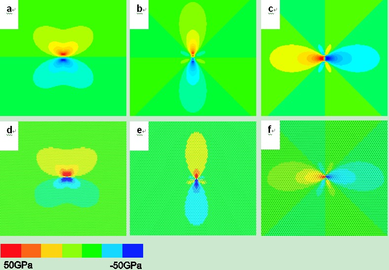 图一:石墨烯中典型5-7环缺陷产生的应力场。 a 到 c 分别为利用旋错理论产生的应力云图σxx, σyy, and txy;e 到 g 为对应的分子动力学计算结果。