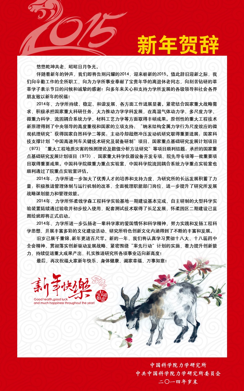 伴随着新年的钟声,我们即将告别闪耀的2014,迎来崭新的2015。值此辞旧迎新之际,我们向辛勤工作的全所职工,向为Q彩网事业奉献了宝贵年华的离退休老同志,向刻苦钻研的莘莘学子表示节日的问候和诚挚的感谢!向多年来关心和支持Q彩网发展的各级领导和社会各界朋友致以新年的祝福!