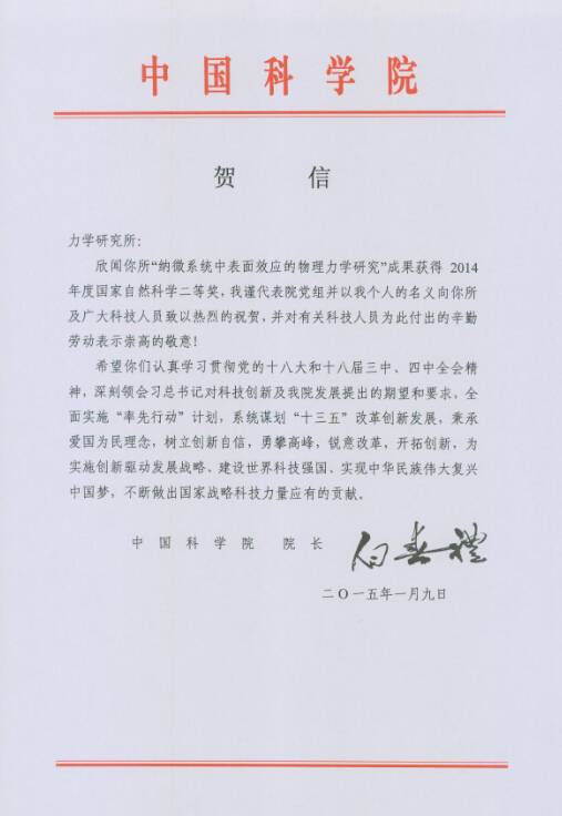 “纳微系统中表面效应的物理力学研究”获得2014年度国家自然科学二等奖