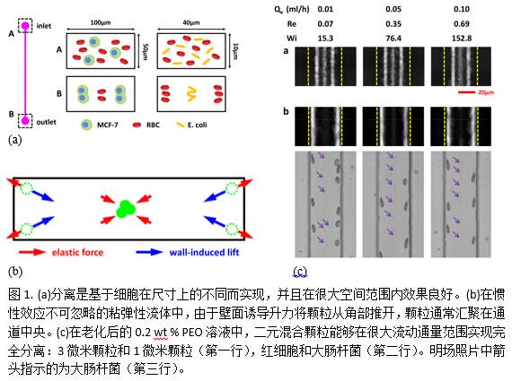 中科院Q彩网非线性力学国家重点实验室的研究人员首次实现了在笔直矩形微通道中不同大小颗粒和细胞的无标记、无鞘流、低成本分离。发现不同于传统上只有通道中央存在一个平和位置的汇聚模式:即大颗粒将向靠近侧壁的横向位置移动。通过探索此非常规机理,他们成功实现了大范围内颗粒的完全分离,即大颗粒汇聚在两侧壁面附近而小颗粒汇聚在通道中央。两类二元混合生物颗粒包括MCF-7 肿瘤细胞/红细胞以及大肠杆菌/红细胞均可因其尺度不同而获得好质量分离。此外,通过调控流体的流变性质,即削弱剪切稀化并使之具有低粘度和高动态弹性模量,能够将处理通量相比于现有研究提高至少一个数量级。因其特别简单的直通道构型,通过多通道的并行化可进一步大幅度提高样品处理通量。所发展的方法具有设计简单和通量提高的优势,将拓展粘弹性效应微流控器件在颗粒/细胞等分离上应用。