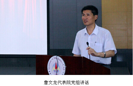 詹文龙副院长代表院党组向新一届领导班子的成立表示了诚挚的祝贺。他充分肯定了上一届领导班子在过去5年任期中求实创新,成绩显著,取得了一批原创性的成果,在解决国家重大战略需求、科研装备和条件建设、科教融合等方面都取得了重要进展。同时对新一届领导班子下一步工作提出了几点殷切希望:第一,以“三严三实”为标准,积极推进“率先行动”计划实施;第二,不断加强领导班子自身建设,充分发扬民主集中制;第三,优化学科布局,加强人才队伍建设;第四,以创新能力为核心,不断深化研究所创新文化建设。