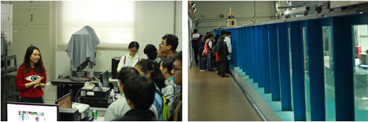 “流线演示实验”、“水面曲线实验”、“磁悬浮模型”、“低速风洞”等大型实验演示设备吸引了很多观众的驻足。志愿者为大家展示流体流经不同障碍物时的曲线变化、磁悬浮列车的悬浮等力学现象,讲解现象背后的卡门涡街、高温超导等科学原理。同学们纷纷开动脑筋提出相关问题,与讲解员进行互动交流。此外,展室陈列着一台我国自主研发、世界上商业运营速度最快的CRH380型高速列车模型,这样,大家听完讲座后还有机会近距离观看高铁列车全貌,进一步增进对高铁的感性认识。