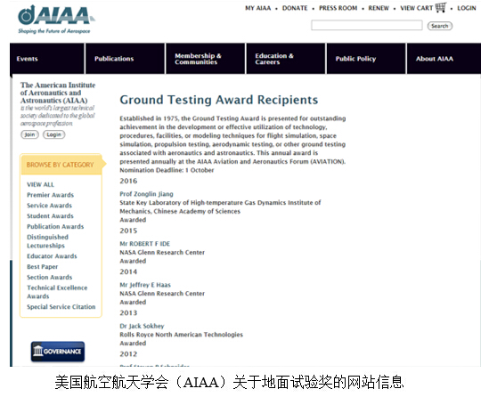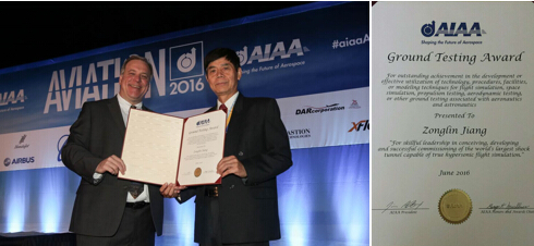 2016年6月15日(华盛顿时间6月14日),美国航空航天学会(AIAA)向姜宗林研究员颁发地面试验奖(Ground Testing Award),以表彰其在创新构想、研发实践和成功运行世界最大的复现高超声速飞行条件激波风洞(JF12)的引领能力。