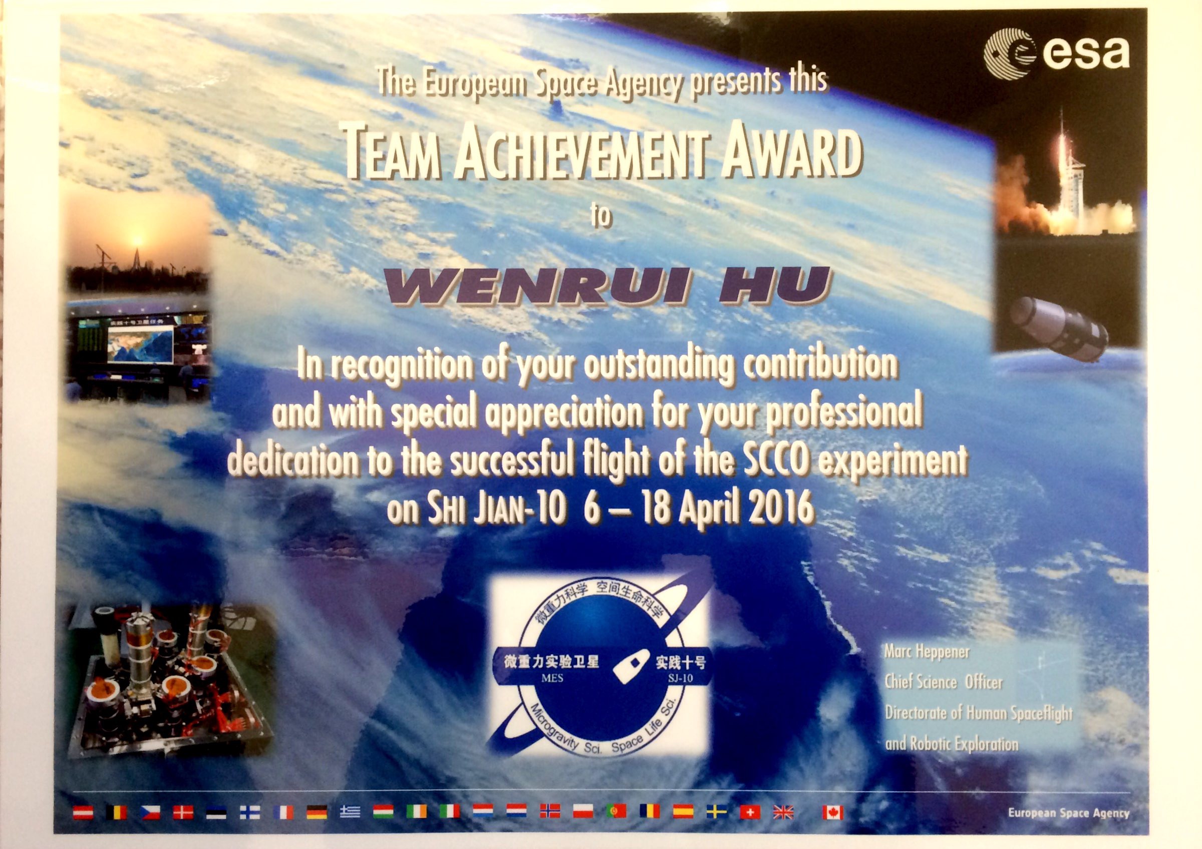 2016年10月18日-19日,实践十号返回式科学实验卫星(以下简称“实践十号”)中欧合作SCCO(Soret Coefficients in Crude Oil)项目各参与方在欧洲空间局空间研究和技术中心召开了SCCO空间实验总结讨论会。在会上,相关团队代表汇报了该空间实验的结果, 总结了取得的成绩。欧空局特别就该项目取得的进展向中方以首席科学家胡文瑞院士为代表的Q彩网项目团队颁发了团队成就奖,以表彰中方有关参与人员对项目顺利开展做出的贡献,赞赏了中方团队在工作中表现出的专业奉献精神。