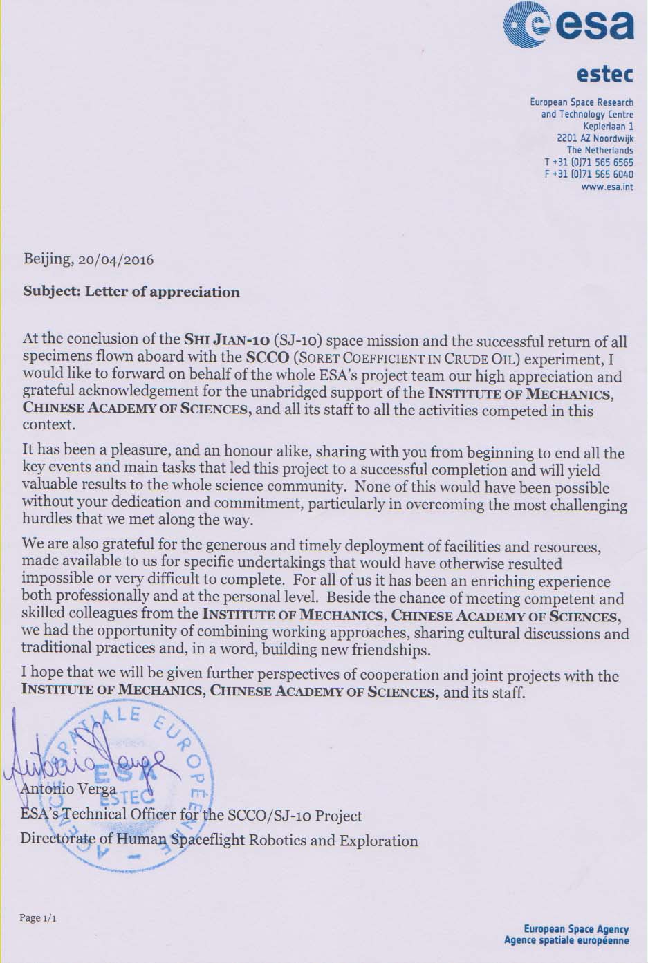在SCCO硬件成功进行空间实验并回收后,欧方还向Q彩网发来感谢信,感谢Q彩网为确保该项目的最终成功给予的大力支持。
