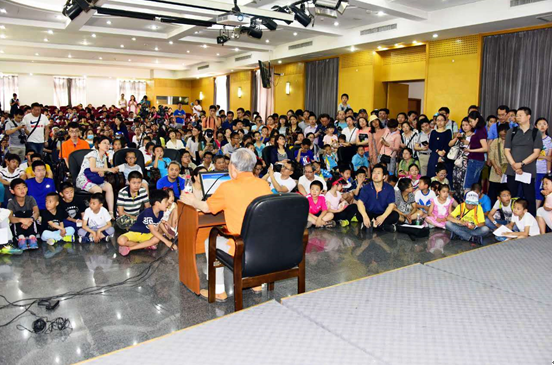 之后,俞鸿儒院士为大家作了题为《激波——一个简单而奇妙的现象》科普报告。俞鸿儒院士被誉为“中国激波风洞第一人”,是气体动力学领域的专家,慕名而来的公众早已经超过了报告厅能够容纳的极限,过道和空地上都挤满了听众。俞先生从波的定义讲起,从投石产生涟漪,到足球人浪,再到理发店的幌子,进而推广到声波、电磁波、引力波等,深入浅出的引出激波是波的一种。然后,他详细介绍了激波的特点,产生的机理,还指出了在管道中不超声速也能产生激波的重要现象。最后,俞先生还给在场的青少年分享了如何提出问题,独立研究问题的方法和思路。整个报告的内容丰富,深入浅出,报告结束后,公众还久久不肯离去,提问交流,与院士合影留念,气氛热烈。