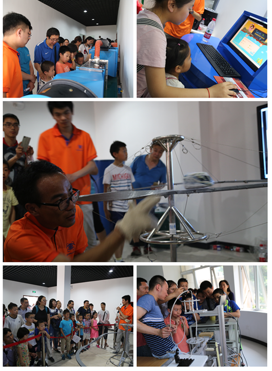 “流线演示实验”、“水面曲线实验”、“磁悬浮模型”、“低速风洞”等大型实验演示设备吸引了很多观众的驻足。志愿者为大家展示流体流经不同障碍物时的曲线变化、磁悬浮列车的悬浮等力学现象,讲解现象背后的卡门涡街、高温超导等科学原理。同学们纷纷开动脑筋提出相关问题,与讲解员进行互动交流。今年新增加的“花式吹牛”项目也受到了热烈的欢迎,孩子和家长都使出了全身力气,看看自己到底“多能吹”。