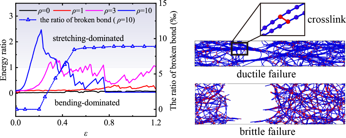 图片说明:(左图)拉伸作用下交联密度ρ对主导变形模式的影响;(右图)交联调控材料的韧脆转变,其中红色为交联。