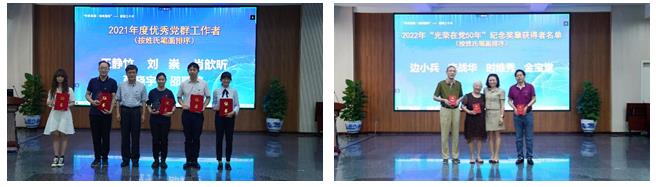 会议第二阶段,召开“七一”表彰大会,由副所长、党委委员魏炳忱主持。会议对2021年度为推动研究所科技创新、构建和谐研究所作出积极贡献的优秀个人和先进集体进行集中表彰,包括2021年度先进基层党组织、先进群团组织、“四强”党支部、优秀共产党员和优秀党群工作者;向老党员颁发了2022年“光荣在党50年”纪念奖章。刘桂菊同志领誓,开展了新党员入党宣誓、老党员重温入党誓词活动,随后刘桂菊向新党员赠送了《中国共产党章程》及科学家精神书籍。