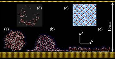 的函数;(2)前驱膜的铺展速度很快,是液滴表面原子扩散到前驱膜前端的结果(图3);(3)前驱膜内有特殊的二维氢键网络(图2e);(4)由于基底的限制作用,前驱膜是类固体(solid-like)性质,其自扩散系数比体相水(bulk water)要小很多。前驱膜通过引入原子细节来消除由非滑移边界条件导致的接触区域无穷大的能量耗散,可以作为移动接触线问题“Huh & Scriven佯谬”的答案之一。