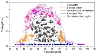 图3. 液滴润湿过程中,不同区域内水分子的迹线。