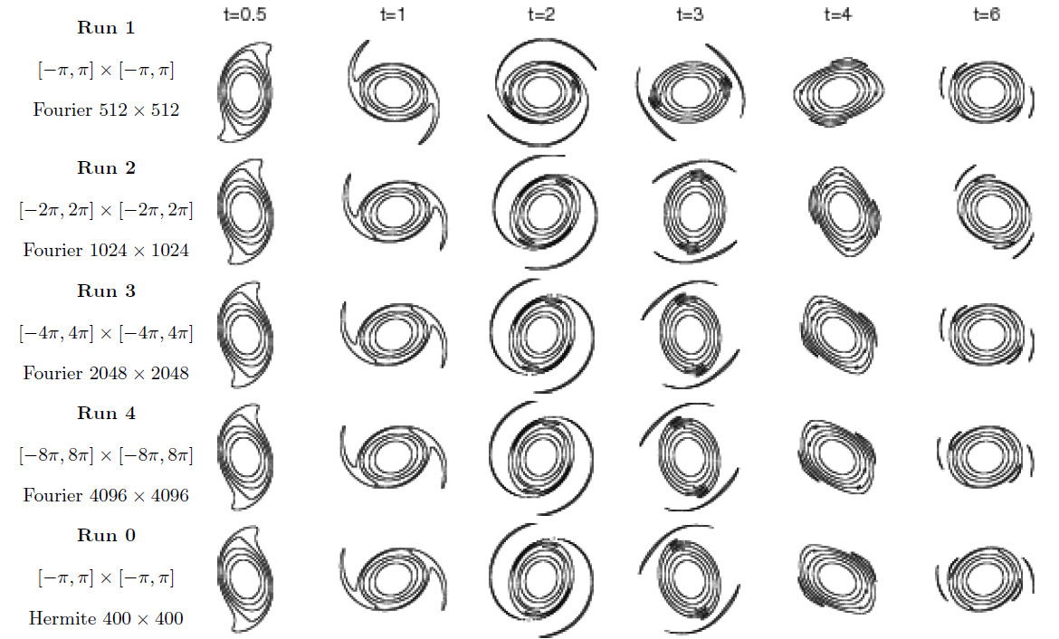 Hermite谱方法模拟(最后一行)和扩大区域算法的Fourier谱方法模拟(前四行)的对比 |