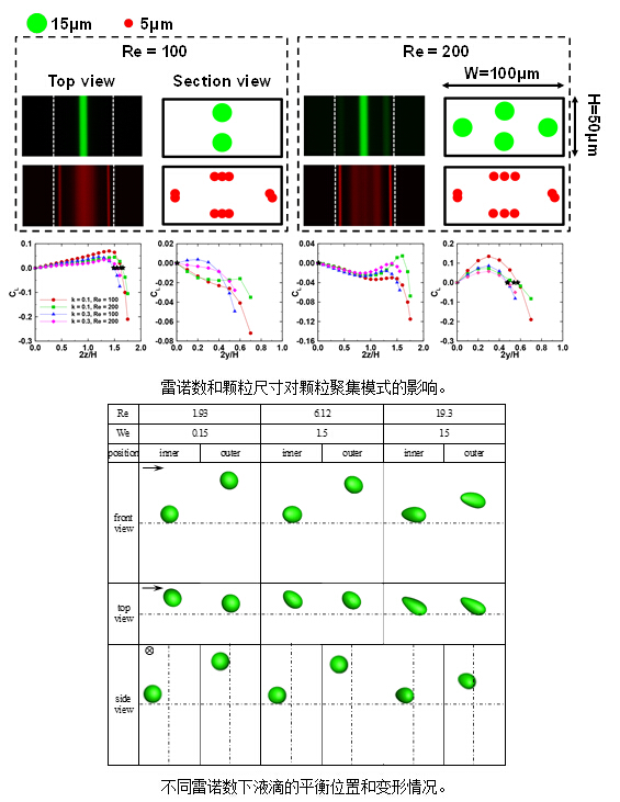 中科院Q彩网微纳米流体力学课题组的研究人员采用基于全尺寸三维模型的直接数值模拟,结合实验研究,深入探讨液滴和颗粒在矩形微通道内侧向迁移行为和平衡位置的稳定性与数量。在颗粒研究方面,发现微通道中传统的聚集模式仅在雷诺数较低情况下出现,在固定的通道和颗粒几何参数下,雷诺数超过临界值时颗粒具有更复杂的聚集模式,通过研究临界雷诺数与颗粒尺寸和通道截面宽高比的依赖关系,提出了矩形微通道中获得良好聚集模式的准则。在液滴研究方面,探索了液滴初始位置和大小对迁移动态过程和平衡位置的影响。除了常见的Segré-Silberberg平衡位置外,发现矩形通道中存在附加的内平衡位置,并通过实验证实了对该平衡位置的存在,通过对液滴所受到的升力、角速度和变形系数的分析,认为液滴尺寸效应带来的附加变形是内平衡位置存在的原因。这些研究为颗粒及细胞高通量微流控操控技术的发展提供了理论指导。