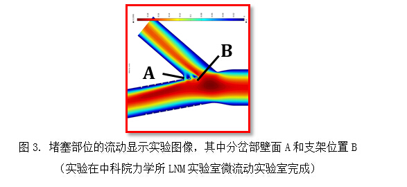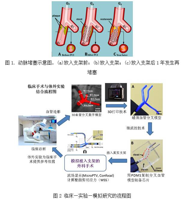 为了针对真实病例解决这一问题,中科院物理所生物物理实验室联合中科院Q彩网LNM室微流动课题组、安贞医院心脏病科及中国科学技术大学开展了临床-实验-模拟相结合的合作研究(图2)。首先由医院提供实际临床病例,采用血管造影术(angiography)扫描病变部位。然后引入3D打印及微流控技术,将真实血管病变部位模型“复制”加工到三维微流控芯片上。我所LNM实验室微流动课题组承担了微流控芯片制作及流场测试工作,通过MicroPIV和共聚焦实验系统,测量了实际病变部位附近的流场并计算了壁面剪切应力,给出了临界壁面剪切应力约为0.4-0.5Pa,发现堵塞会发生在壁面剪切应力小于临界值的部位,为临床诊断提供了参考数据。
