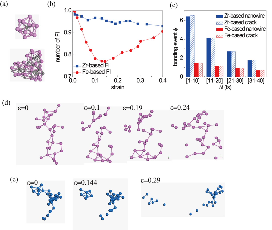 图二:(a)原子团簇组成的正二十面体以及多个团簇组成的示意图。(b)加载过程中Zr基和Fe基团簇数目的变化。(c)团簇自愈合能力的比较。(d)加载过程中Zr基团簇自愈合示意图。(e)加载过程中Fe基团簇断裂示意图。