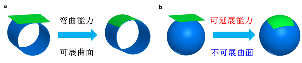 图1 a)与可展曲面贴合,只需可弯曲能力;b)与不可展曲面贴合,必需可延展能力