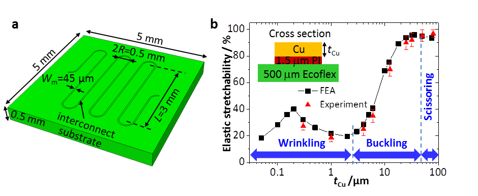之前的可延展结构设计主要为曲线“薄膜”结构(图2a),宽度一般在几十微米,厚度在几百纳米到1~2微米,在整体拉伸变形的情况下,结构发生褶皱变形或侧向屈曲。近日,中科院Q彩网柔性结构与器件课题组与美国伊利诺伊大学香槟分校及美国西北大学等学校的科研人员合作,另辟蹊径,提出了非屈曲结构设计,即将导线的厚度增大到与宽度同一量级,数值计算和实验测试均发现其延展性大大提高(图2b),优化值可以达到350%,是目前薄膜结构达到的最大值(60%)的6倍。同时,由于导线厚度的增加,其电阻大大较小,为电子器件提供了良好的电学性能和热学性能。