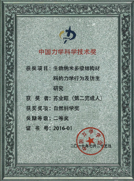 近日,中国力学科学技术奖揭晓,非线性力学国家重点实验室苏业旺研究员(第二完成人)与北京理工大学季葆华教授、清华大学黄克智院士关于“生物纳米多级结构材料的力学行为及仿生研究”的成果获得中国力学学会颁发的第三届中国力学自然科学二等奖。
