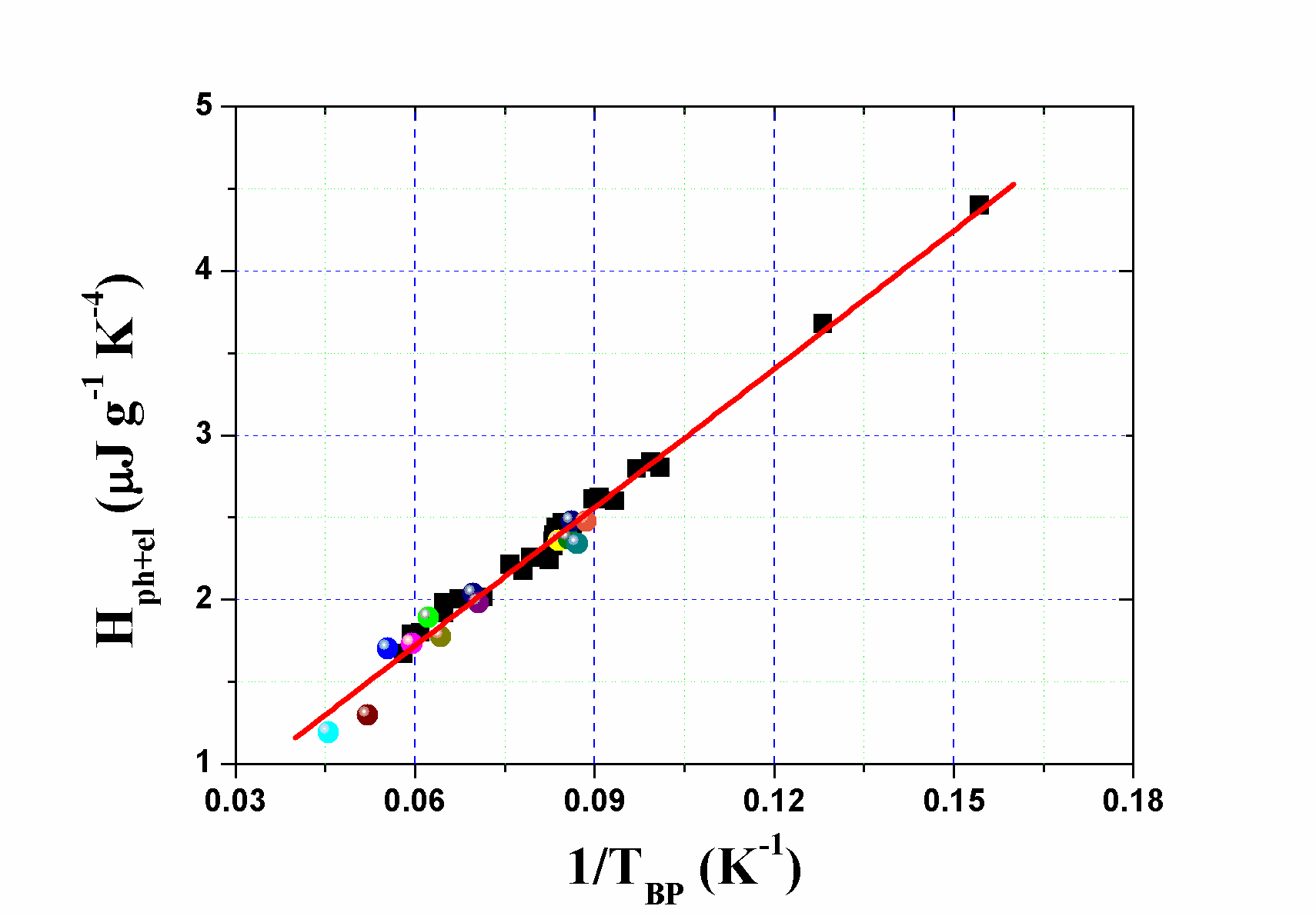 图1 非晶合金低温比热波色峰强度与位置的普适反线性关系