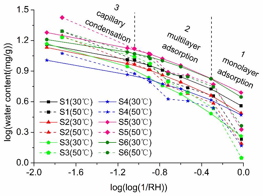 图3 吸附模型与实验数据拟合(Shen et al., 2018) 图4 FHH曲线确定吸附水状态界限(Shen et al., 2018)