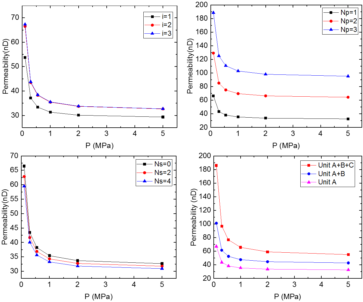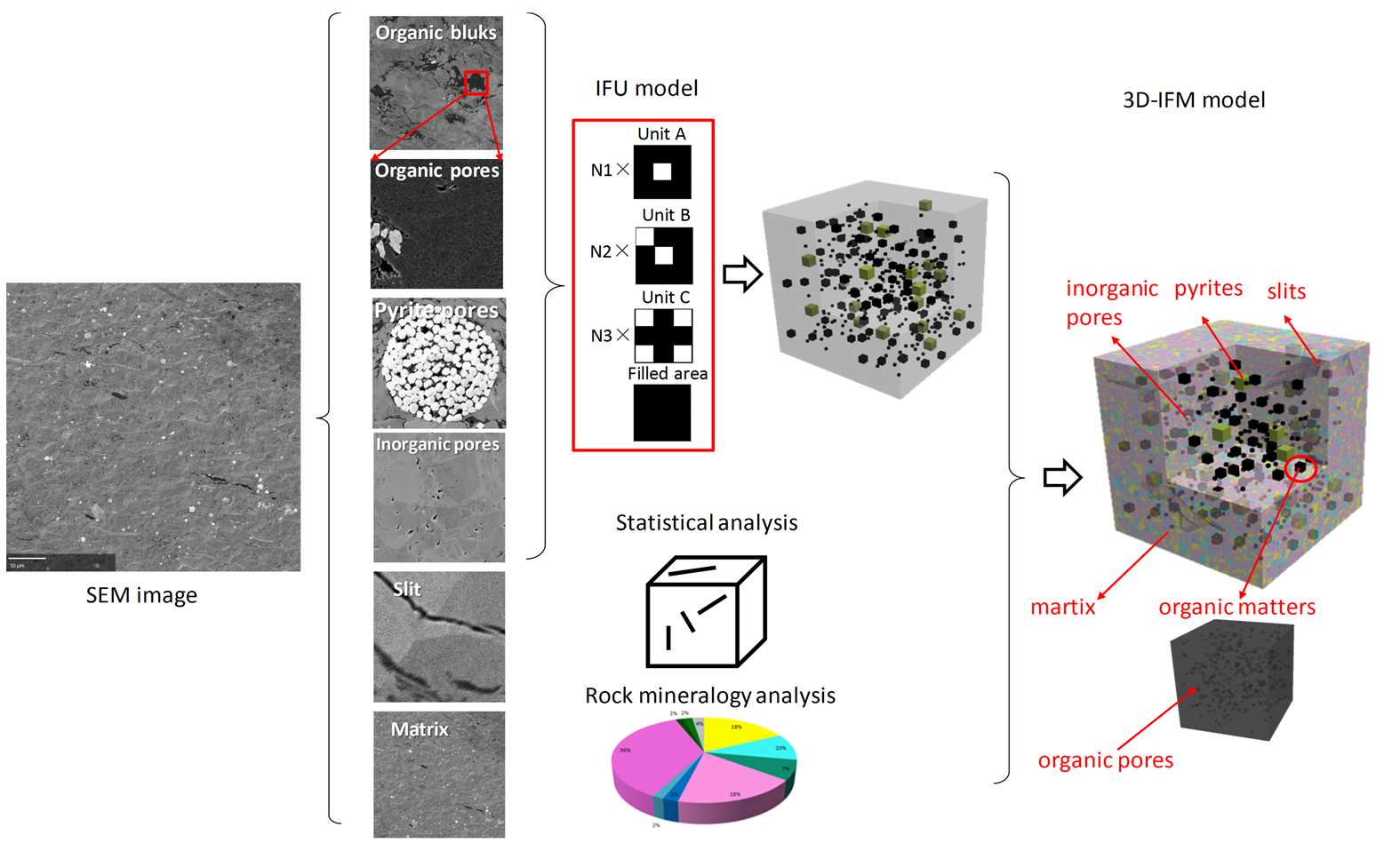 研究团队以四川盆地下志留统龙马溪组页岩样品的SEM图像数据,分别针对页岩的三大类典型特征:有机质块体和有机孔,黄铁矿和其中的有机孔,无机孔和裂缝等,利用混合分形单元(IFU, intermingled fractal unit)法,提取各类渗流空间的分形特征,提出准三维的混合分形模型(IFM, intermingled fractal model)。该模型与真实岩样的累计孔径分布频谱一致,能够有效表征不同尺度下的页岩孔隙结构特征。利用该模型,研究团队对页岩气的渗透率进行了敏感性分析,并将渗透率计算结果与实验数据进行了比较验证。