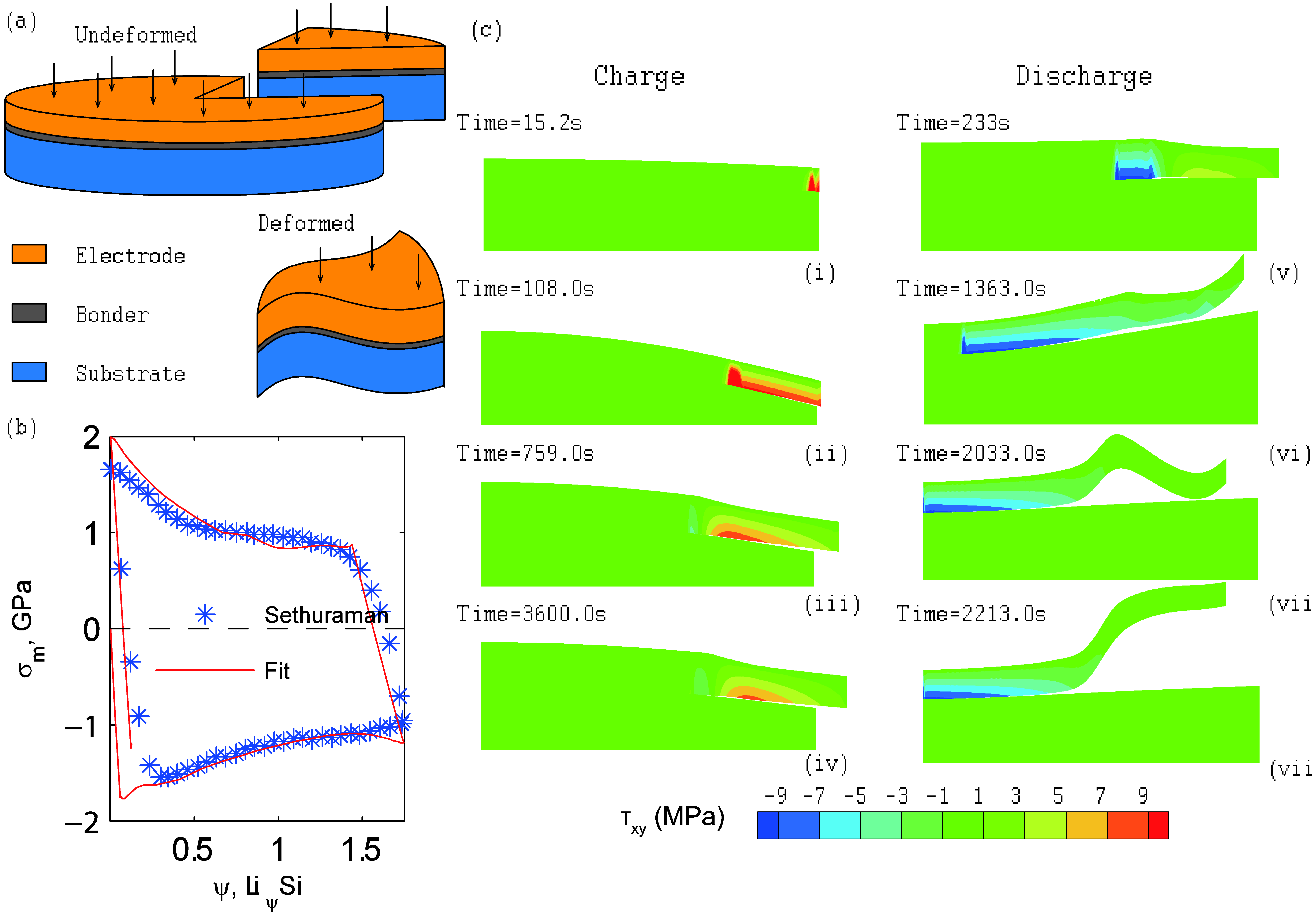 图:典型层状电池结构及其变形。(a)电极薄膜-粘接剂-基底结构;(b)数值模型与实验结果的对照,展示充放电过程时电极膜中的应力变化;(c)电极材料的弹塑性与界面破坏情况下的薄膜内部剪切应力分布图。