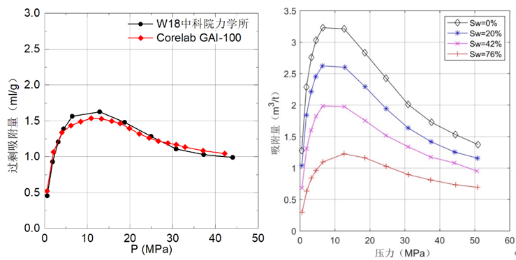 图3 高压气体吸附仪与进口设备的同样测试结果对比及不同含水饱和度吸附等温线测试