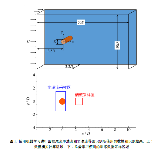 Q彩网非线性力学国家重点实验室杨子轩研究员等人提出使用极端梯度提升法(XGBoost)算法对圆柱尾流(图1上)中的湍流/非湍流界面进行识别。XGBoost方法可以同时处理多个输入变量,为了得到与坐标系无关的识别模型,我们选择流动变量中的不变量作为模型输入,经过一系列湍流输运方程的推导,我们选择了平均运动的应变率张量`S和涡张量`Ω、脉动应变率张量S'、脉动涡张量Ω'、以及这些张量的二次张量的所有非平凡不变量,再加上脉动速度能量k共计16个物理量作为输入变量进行模型训练。XGBoost方法属于机器学习中的监督学习方法,除了给出训练样本的输入变量外,还需要给出对应的流动状态,因此我们从流动状态已知的区域进行采样(图1下),训练完成后将模型用于全场,得到每一个离散点上的流动状态,从而得到湍流/非湍流界面(图2中的实线)。