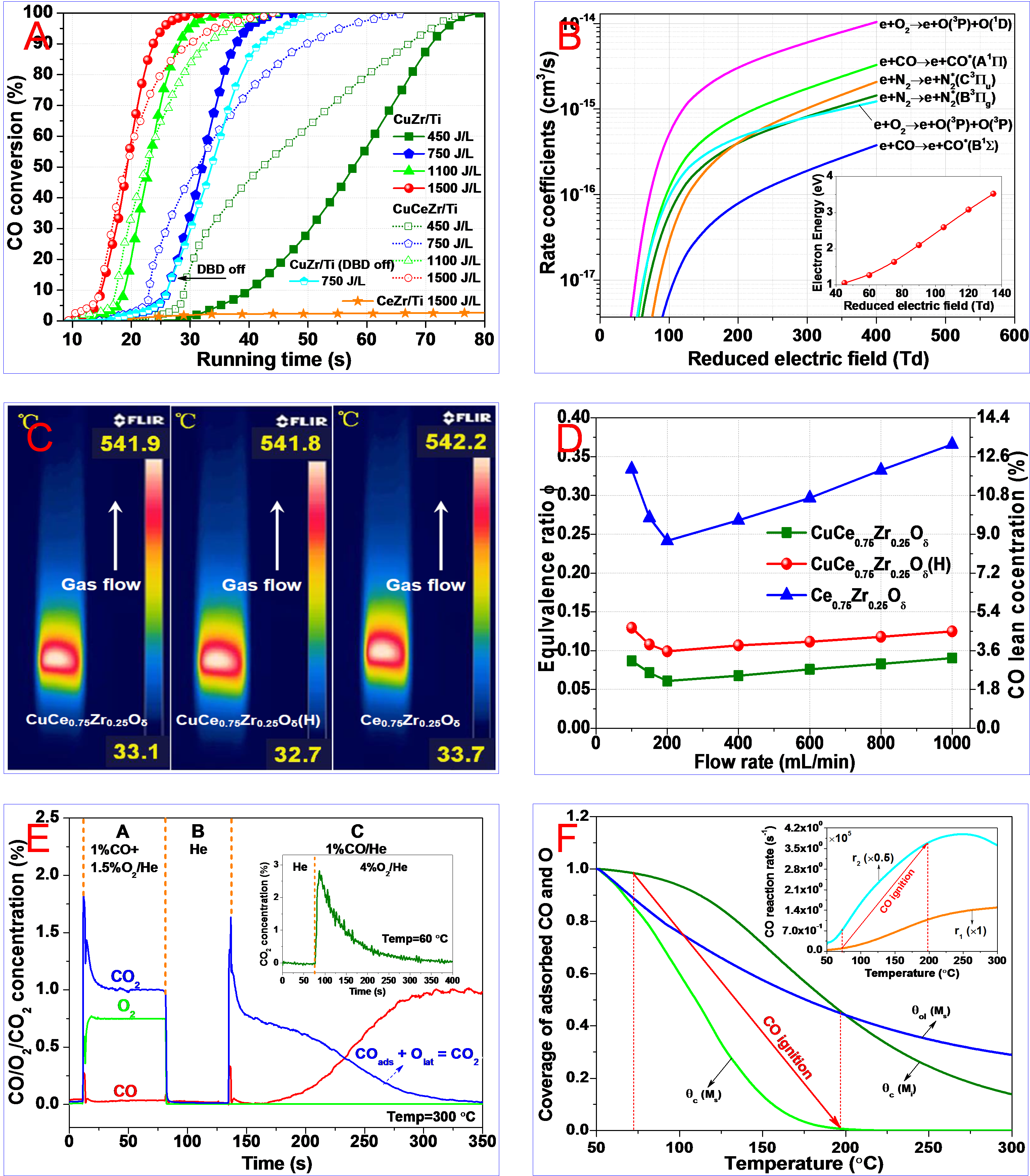 图1 低温等离子体与热催化技术相结合实现CO快速引燃过程(A)及等离子体反应路径(B);CuCe0.75Zr0.25Oδ催化剂上CO自持催化燃烧的二维温度场(C)及稳燃极限(D);CO引燃诱导、自持催化燃烧阶段质谱瞬态响应实验结果(E)及双稳态反应动力学模型(F)