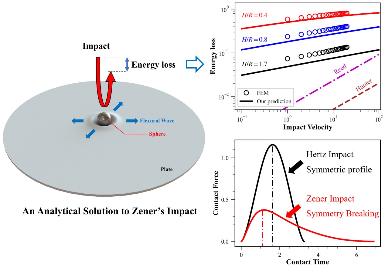 接触动力学过程中,能量耗散的原因之一为弹性波在被接触物体中的传播。目前经典的Hertz接触动力学模型中,假设被接触体为半无限大空间体,弹性波产生的能量耗散不大于5%。在实际情况如航天器、管道、帆板等结构中,被接触体多为有限厚度板,不同于半无限大体,有限厚度板的变形显著影响了接触力历史(接触力-时间曲线的对称性缺失,图1),而定量化接触力历史是该领域的难题之一。该论文的研究探讨此类有限厚度的结构是如何影响接触过程中的接触力历史和能量耗散。研究给出了接触力历史的解析表达式,发展了考虑板厚的接触能量耗散模型,由此计算出的能量耗散远大于5%。此外,结果还表明:板在接触过程中的能量耗散正比于碰撞速度的0.2次方,而不是基于经典Hertz模型给出的正比于碰撞速度的0.6次方(图1)。