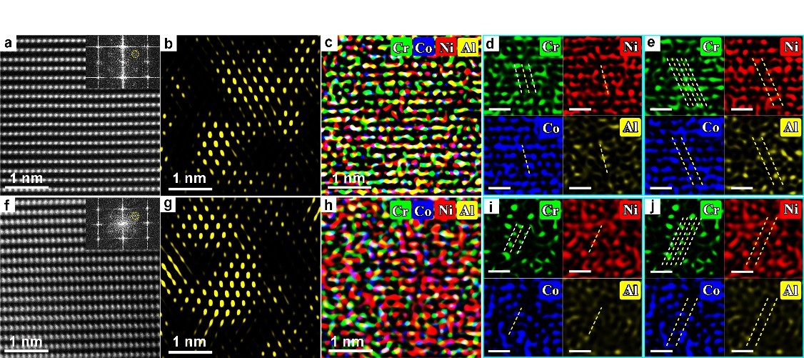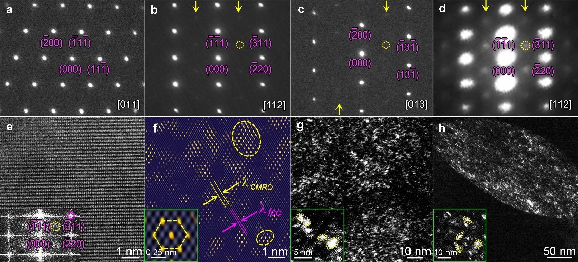 等金属间化合物) 是否就是这些短程有序发展而来的?注意到,最/次近邻原子层短程有序的尺度范围在亚纳米尺度,并没有点阵周期性,短程有序更像是一个化学结构基因,不知道它会生长成什么样子,因而无法从短程有序直接过渡到长程结构。我们猜想,在短程与稳定的长程结构之间,应该存在一个在尺度上比短程大、但已具有明确晶体周期性的过渡结构,称之为化学中程有序 (Chemical Medium-Range Order, CMRO),虽然还从未在高熵合金中提出过化学中程有序结构的概念。发现并证实中程有序结构的存在,有助于更进一步理解高熵合金中本征的原子尺度微结构、特别是局部化学有序及其演化过程。