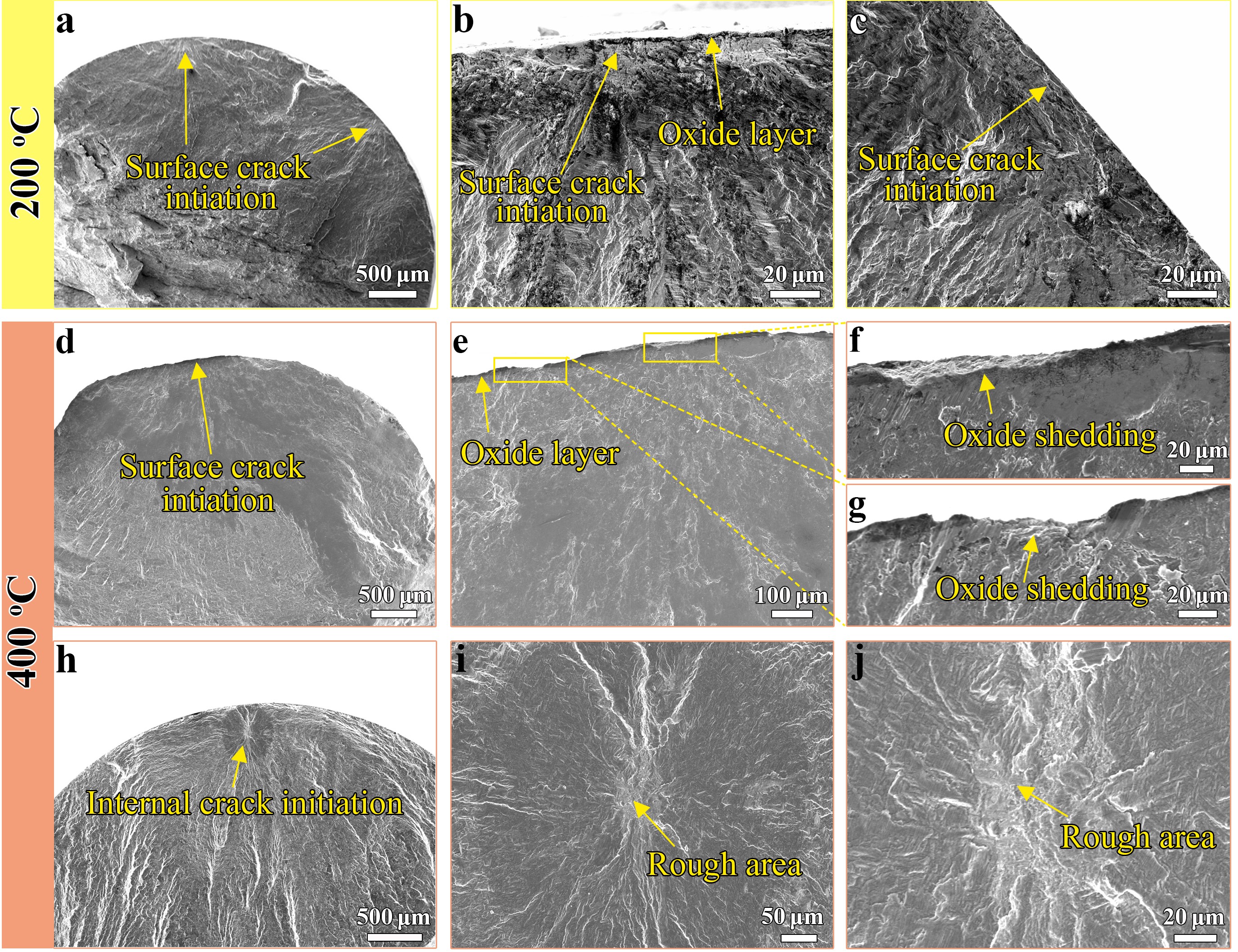图1光滑试样疲劳断口SEM图像. a-c: 氧化物入侵诱导的表面裂纹萌生(200℃, σa=650 MPa, R=-1, Nf=2.7×104 cyc), b和c分别是a中上面和右侧裂纹萌生区域的放大图. d-g: 氧化物脱落诱导的表面裂纹萌生(400℃, σa=520 MPa, R=-1, Nf=7.6×105 cyc), e是d中裂纹萌生区域的放大图, f和g分别是e中相应区域的放大图. h-j: 内部裂纹萌生(400℃, σa=520 MPa, R=-1, Nf=1.0×106 cyc), i和j分别是h和i中裂纹萌生区域的放大图