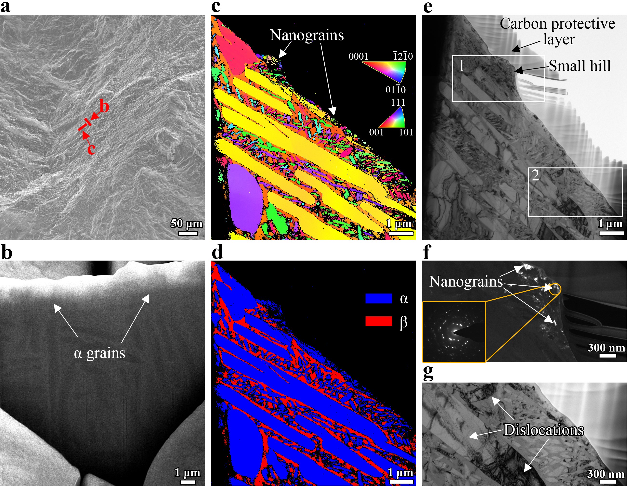 图2 400℃光滑试样(σa=520 MPa, R=-1, Nf=1.0×106)疲劳断口粗糙区域微结构观测结果. a: SEM图像, 短线为提取位置. b: a中位置b沿主应力方向剖面SEM观测结果. c-e: a中位置c沿主应力方向剖面的反极图、相图和TEM图片. f和g: 分别为e中区域1的暗场像和区域2的放大图.