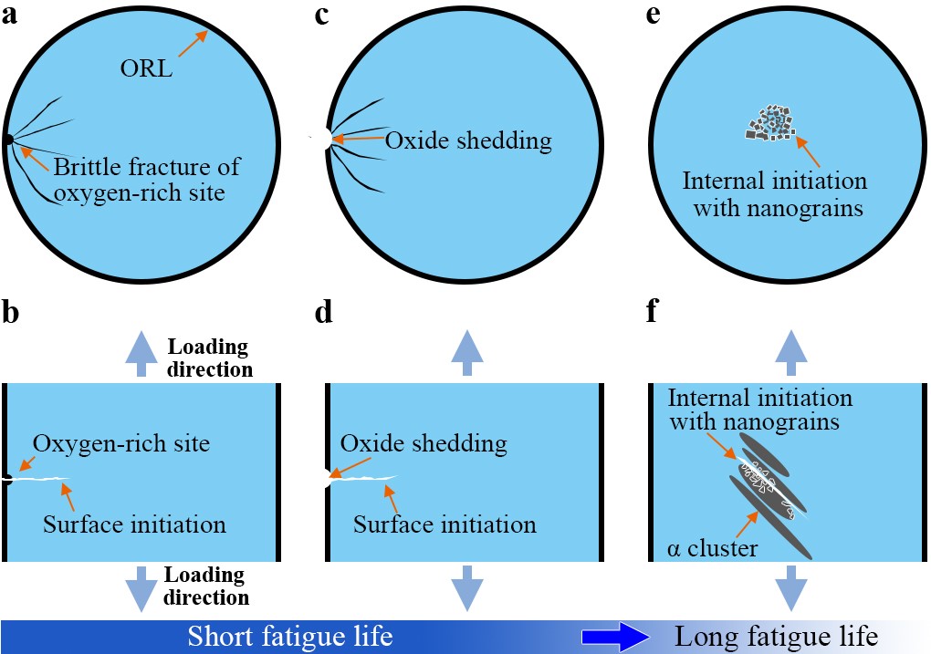 图3 400℃时TC17钛合金表面裂纹萌生和内部裂纹萌生竞争模型. a和b: 富氧部位脆性断裂引发表面裂纹萌生的横截面图和侧面图. c和d: 氧化物脱落引发表面裂纹萌生的横截面图和侧面图. e和f: 内部裂纹萌生的横截面图和侧面图
