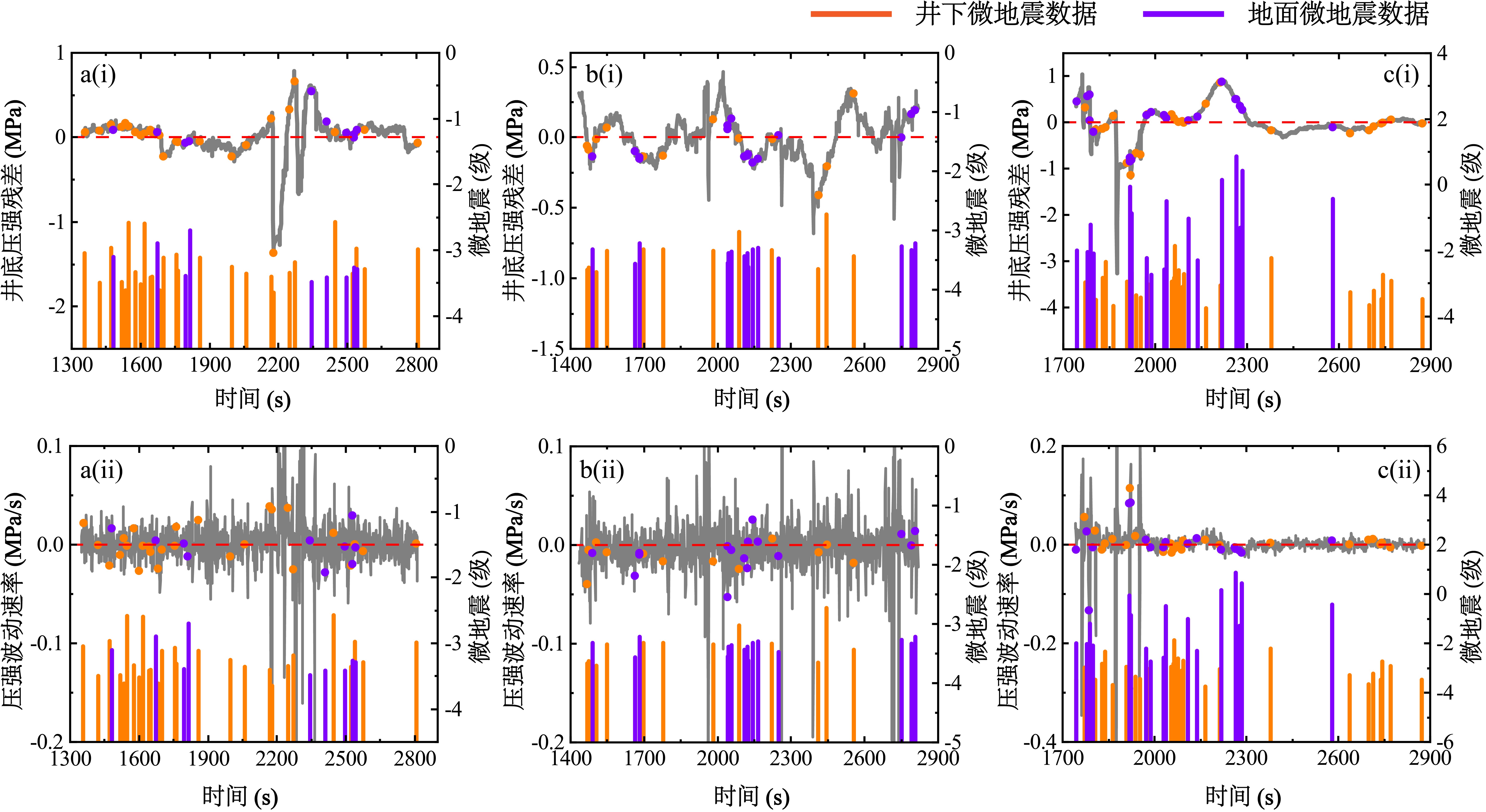 研究团队充分考虑工程现场的“套管压力”、“油管压力”、“加砂”与“泵注排量”四条压裂施工曲线,对加砂前压裂过程开展深入剖析,提取得到储层原位脆性指数。同时,依托该团队此前首次用于地质材料评估的“Ashby 图”研究范式(Materials 2020, 13, 2517),对储层脆性进行了横向系统评估,由此构建起一整套数据分析与储层评估方法(图 1)。此外,该团队还将开发现场的实时微地震数据与压裂施工曲线相结合,提出了可实时监测储层断裂特征的分析方案。研究表明,由于深部页岩储层处于三轴应力、高温高压的极端环境中,其原位断裂韧性为实验室测量值的2 ~ 3倍,进而导致其原位脆性远低于实验室测量值;现场施工曲线的压强标度率范围 (-1/2 ~ -1/6) 宽于现有理论预测值 (-1/3 ~ -1/5);且有78 % 的储层微地震事件可由施工曲线实时监测(图 2)。该研究可为我国深部页岩难以形成复杂水力裂纹网络的现象提供关键性的理论解释,并为压裂方案的精确制定和实时优化提供指导。