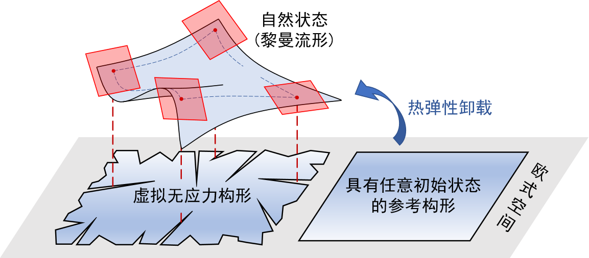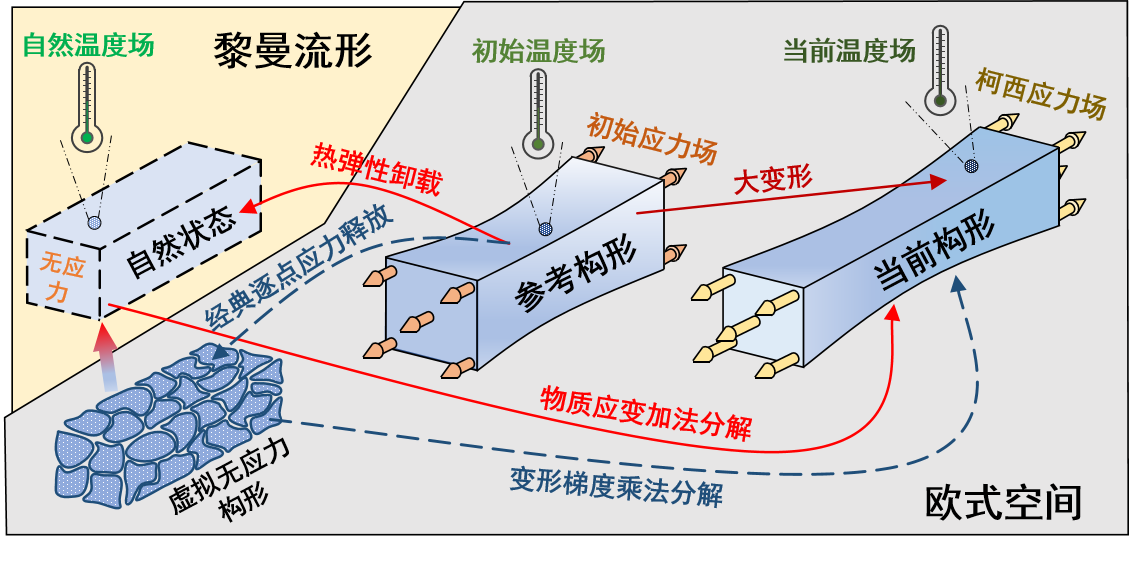 初始应力广泛存在于各种固体材料,诸如干酪根的熟化与热解,生物组织的非均匀生长,金属材料的相变,工件的表面改性,土木工程结构的预制,甚至地质运动等。初始应力对固体材料的力学行为产生着重要影响,可维持材料内部的力学平衡,影响生物组织的生长和形貌以及在蒸发过程中诱导屈曲等。同时,材料中广泛存在热-力耦合行为,相同的初始应力可能具有不同的热弹性变形历史从而对应完全不同的本构关系。因此,如何在本构理论中考虑初始状态(初始应力和初始温度)的影响,被认为是理性固体力学的一个基本难题。