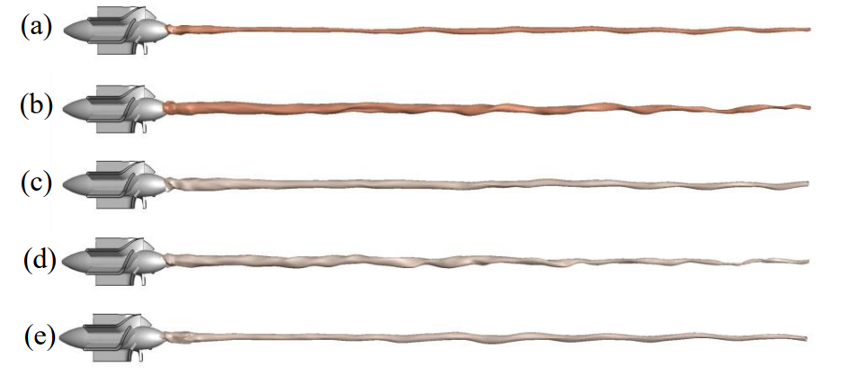 图1 不同幂率参数条件下的气柱形状(a. k=0.01337 Pa.sn,n=0.08056,αgiso=0.8,Re=25447;b. k=0.01337 Pa.sn,n=0.08056, αgiso=0.8, Re=6997;c. k=0.02 Pa.sn,n=0.65,αgiso=0.65,Re=5836;d. k=0.02 Pa.sn,n=0.89,αgiso=0.65,Re=3732;e. 纯水,αgiso=0.65,Re=64280)