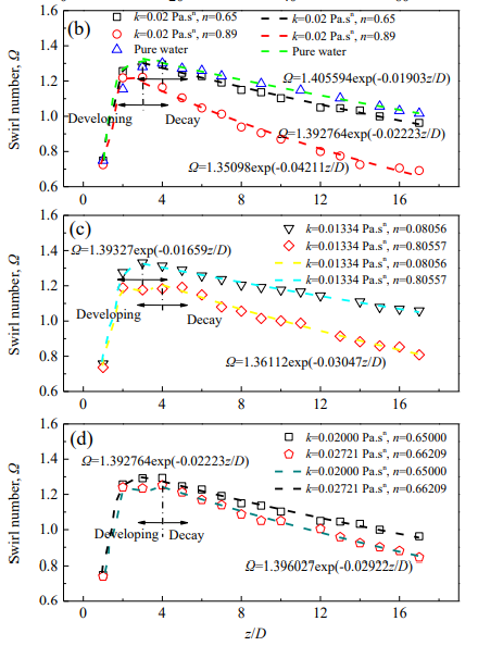图2 不同幂率参数下的沿程旋流强度变化(b. k=0.02 Pa.sn;c. k=0.01334 Pa.sn;d. k=0.2000 Pa.sn,n=0.65,vs. k=0.02721 Pa.sn,n=0.66209)