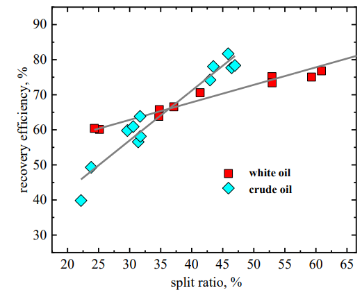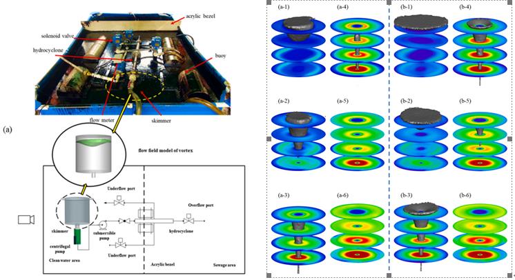 另一方面,海洋石油开发和海洋航运过程中可能发生油品泄漏事故,威胁个人和公共安全,对海洋生态环境造成严重破坏,需在短时间内快速回收溢油。受结构形式限制,目前传统的机械式撇油器(堰式、真空式、盘式等)难以快速高效回收海面溢油,急需从机理上突破,提高回收速度,改善回收效果。Q彩网多相流及流固耦合课题组基于旋流分离技术的积累,结合自由表面旋涡质点迁移运动特性提出一种新型溢油回收理念,即以自由表面旋涡富集油相以提高处理量,通过旋流分离浓缩回收的油水混合液以改善回收效果。以白油和渤海中质原油为溢油,开展原理性测试(图3);同时进行数值模拟,细化自由表面旋涡区域内的相分布及速度分布规律,探究油品性质对回收特性的影响。研究揭示了自由表面旋涡区域形成及油相富集过程(图3),同时给出了不同油品的回收效率曲线(图4)。在国家自然科学基金(No. 12102436)和先导B(XDB22030101)的资助下,相关研究成果以“Effect of oil properties on spilled oil recovery using a mechanism coupling surface vortices and cyclone separation”[2]发表于Ocean Engineering,中科院Q彩网刘硕助理研究员为通讯作者。
