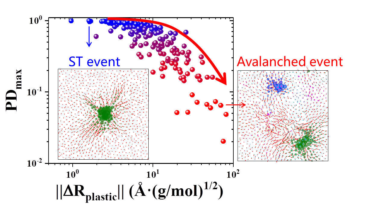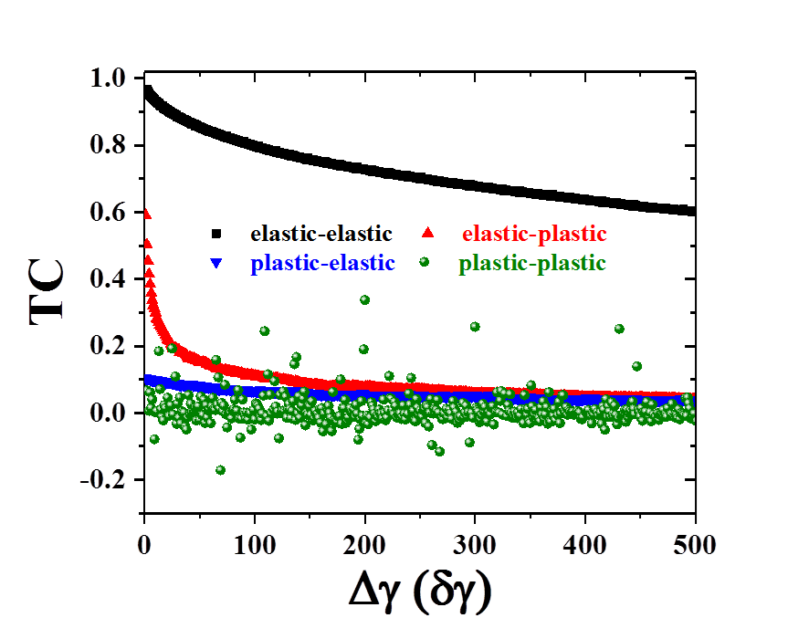 不同于晶体塑性的位错机制,非晶态固体塑性变形的基本载体是原子或粒子以集团模式的局域协同重排,通常被称为“剪切转变”(shear transformation,以下简称 ST)。通过非局域弹性效应,ST事件可自组装形成不同时空尺度的塑性事件,如宏观屈服、局部化剪切带等。研究表明,邻近屈服以及屈服后的塑性事件处于一种时空高度关联的雪崩状态。但是在远离屈服的宏观弹性阶段,塑性事件是否存在时空关联以及事件之间如何相互作用,在领域内存在很大争议。Q彩网蒋敏强研究员等针对该争议问题开展研究,取得重要进展。
