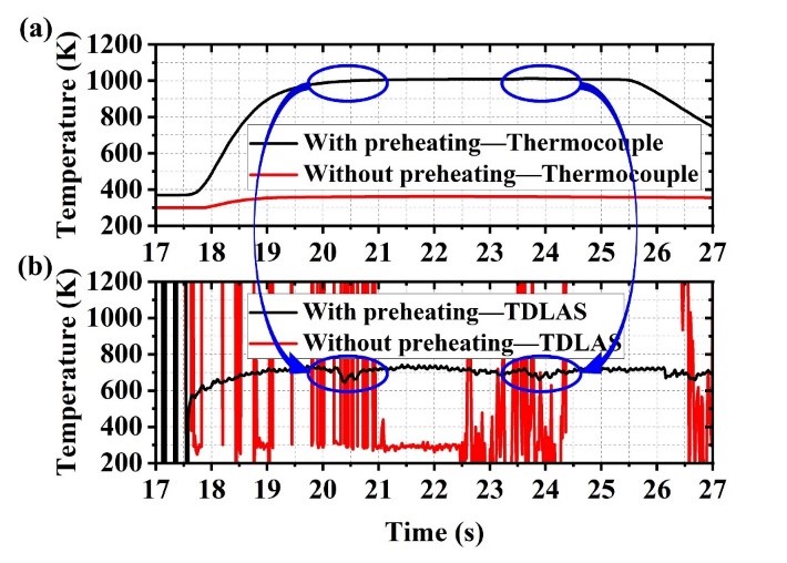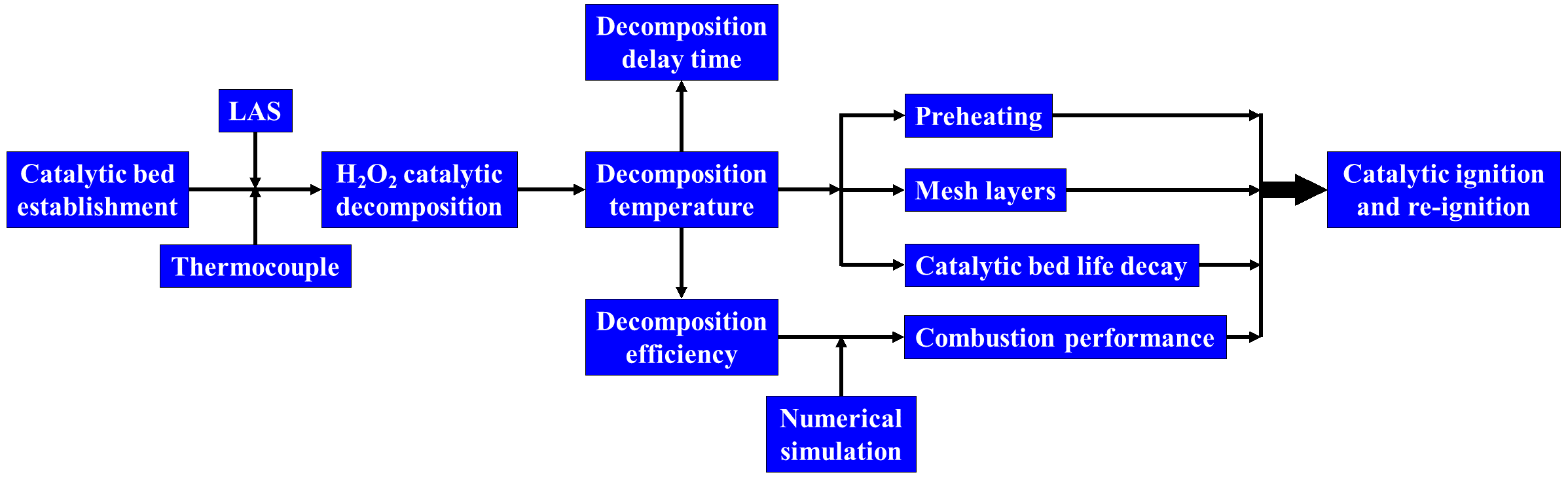 Q彩网高温气流激光诊断研究团队在H2O2/石蜡基固液火箭发动机(HRE)催化重复点火及燃烧特性研究中取得进展。结合激光吸收光谱、燃烧场数值分析等手段,开展石蜡基燃料在90%H2O2作用下的催化点火和重复点火研究(逻辑思路如图1所示)。以H2O2分解温度的变化为分析前提,采用热电偶和基于H2O吸收的激光吸收光谱技术进行监测。分析预热、银网层数和催化床使用次数对H2O2分解特性的影响;与此同时,建立了H2O2分解效率衰减对HRE燃烧特性的影响的二维数值模型;最后,通过静态点火实验明确H2O2/石蜡基HRE催化点火和重复点火性能。研究结果表明,催化床预热是提高H2O2初始分解速率进而提高点火成功率的关键因素(如图2和图3所示)。过多或过少的银网层数和连续重复使用催化床分别因热损失和使用寿命下降而降低分解温度。在60层床层预热条件下,分解延迟时间小于0.5 s,分解效率为100%。重复点火使分解效率逐渐降低,降低的速率约为0.0625%/s。数值模拟结果表明,H2O2分解效率越低,发动机燃烧性能越差(如图4所示)。当H2O2分解效率继续下降到80%时,由于H2O2的质量损失,发动机燃烧性能存在突降现象。最后,地面燃烧实验(如图5所示)验证了H2O2/石蜡基HRE重复点火可靠,无点火压力峰。