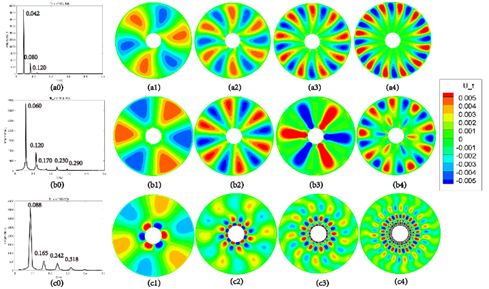 图 2 速度场特征模态及其对应特征频率示意图(由上到下温差依次为10K, 20K和50K, 体积比1.1131)