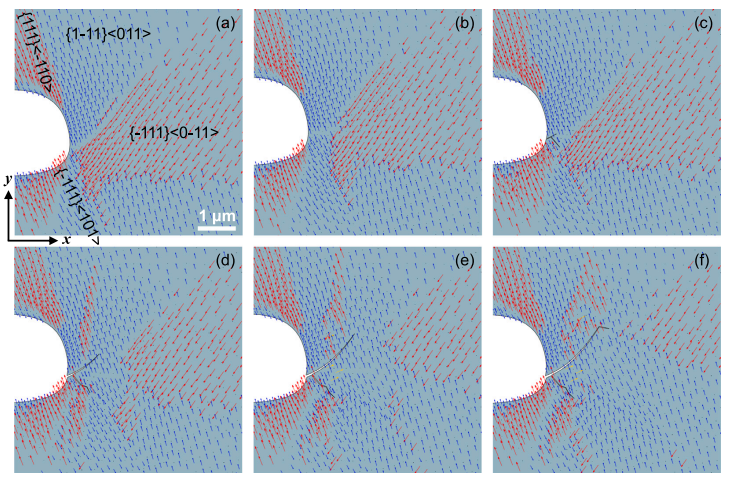 图2 裂纹萌生早期缺陷附近最大激活滑移系的演化(a) N=1×104, (b) N=5×105, (c) N=2.5×106, (d) N=4.5×106, (e) N=6.5×106, (f) N=8.5×106。